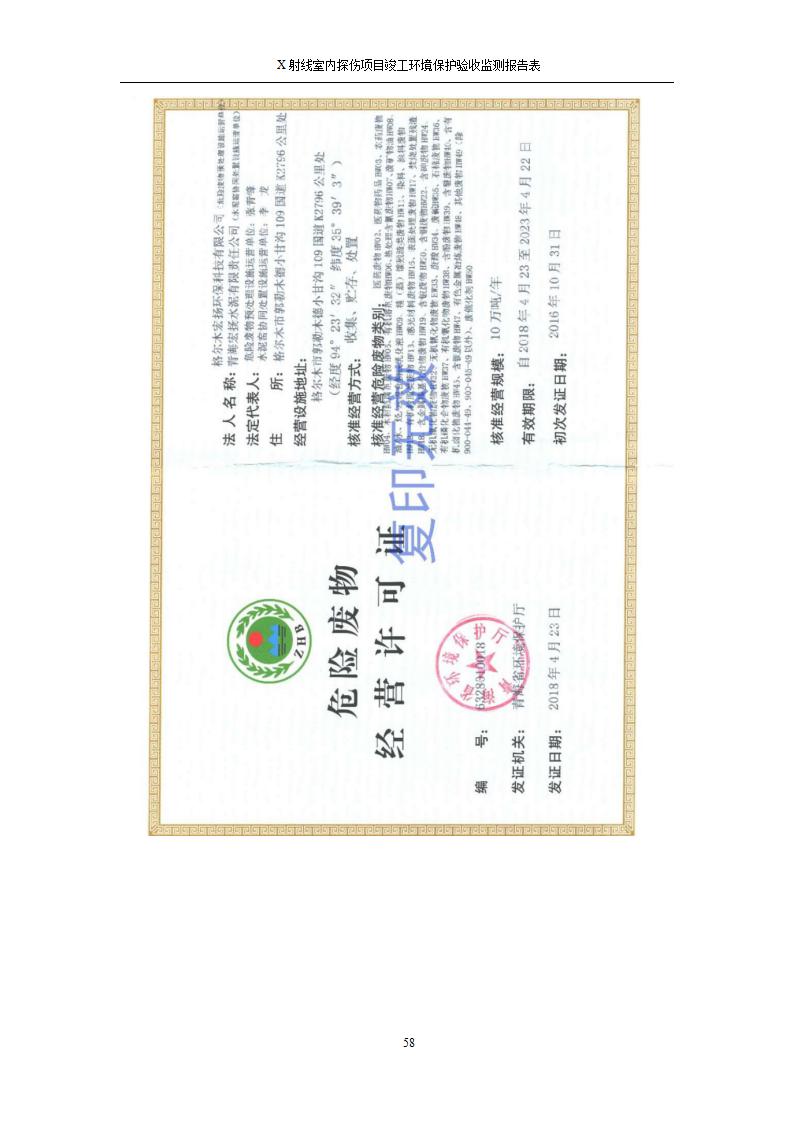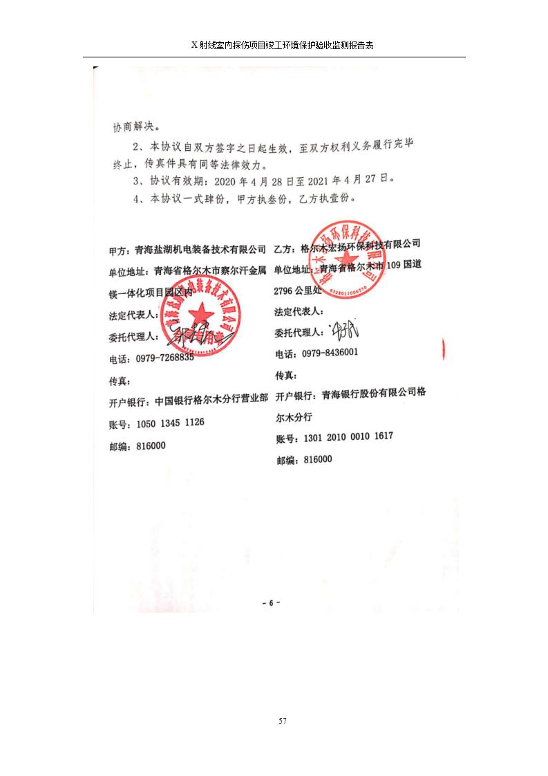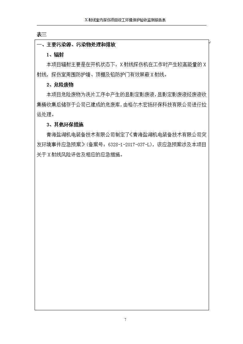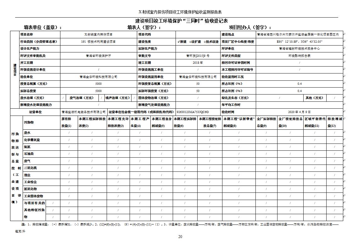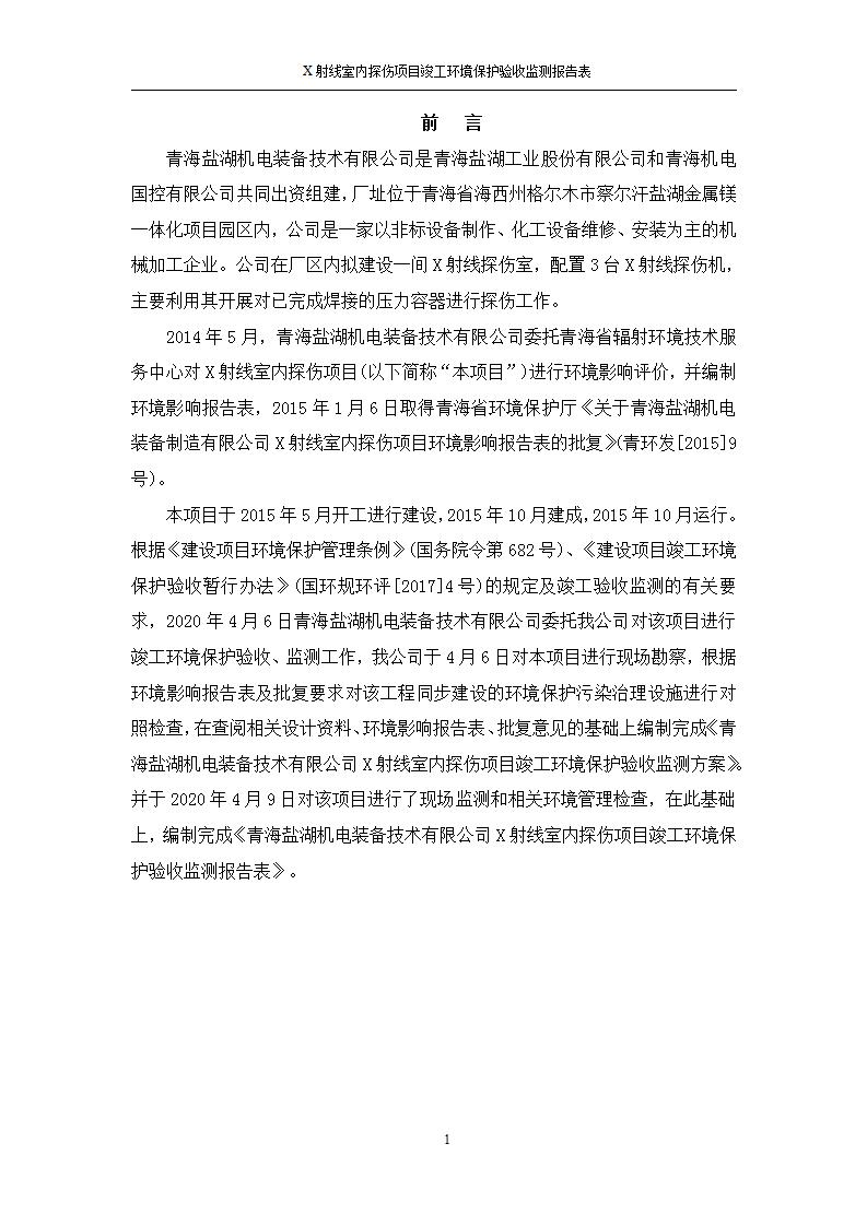 根據(jù)中華人民共和國國務(wù)院令第682號《國務(wù)院關(guān)于修改〈建設(shè)項(xiàng)目環(huán)境保護(hù)管理?xiàng)l例〉的決定》和《建設(shè)項(xiàng)目竣工環(huán)境保護(hù)驗(yàn)收暫行辦法》(國務(wù)院令682號),青海鹽湖機(jī)電裝備技術(shù)有限公司X射線室內(nèi)探傷項(xiàng)目竣工環(huán)境保護(hù)驗(yàn)收監(jiān)測報告表公示如下。 一、項(xiàng)目名稱:X射線室內(nèi)探傷項(xiàng)目竣工環(huán)境保護(hù)驗(yàn)收監(jiān)測報告表 二、地點(diǎn):青海省海西州格爾木市察爾汗鹽湖金屬鎂一體化項(xiàng)目園區(qū)內(nèi) 三、建設(shè)單位:青海鹽湖機(jī)電裝備技術(shù)有限公司 四、建設(shè)內(nèi)容:本項(xiàng)目位于公司三號車間廠房內(nèi),探傷室長21m,寬9.3m,共有3臺X射線探傷機(jī)。 五、聯(lián)系人:楊工 六、聯(lián)系電 話:0971-6515411 七、公示時間:二〇二〇年七月十日至二〇二〇年八月六日 公示期間,對上述公示內(nèi)容如有異議,請以書面形式反饋,個人須署真實(shí)姓名,單位須加蓋公章。
